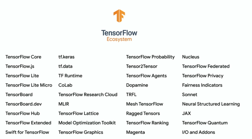 - 영상에서는 TensorFlow Ecosystem을 언급하는데, 다음 그림을 보면 무엇인지 바로 확인할 수 있습니다.