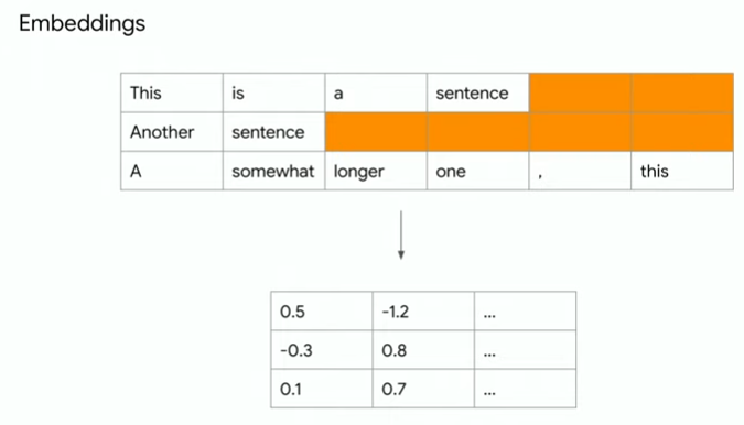예를 들어, 텐서플로우는 다음과 같은 예를 임베딩 형태로 만들어 줍니다.