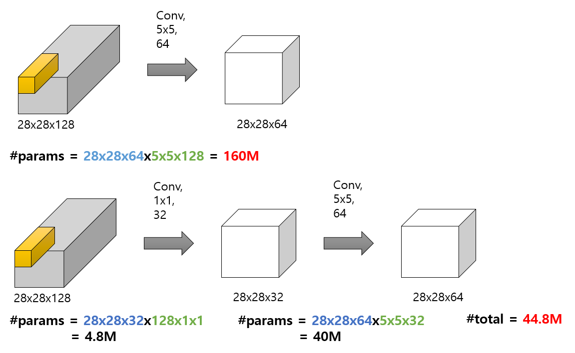 - 빨간색 글씨는 해당 과정에서 사용되는 전체 파라미터 개수를 의미합니다. 윗 부분은 160백만개의 파라미터 수가 필요하고, 아랫 부분은 약 44백만개의 수가 필요하네요. 대략 4배의 차이입니다. 이처럼 1x1 컨볼루션을 사용하면, 사용 유무에 따라 모델 파라미터 수가 급격하게 차이가 납니다.
